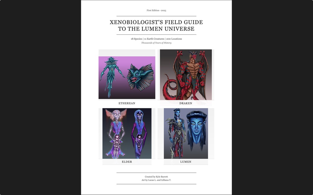 The complete 59-page digital guide. Dive deep into the universe with professional art and essential lore for all 18 sapient species and 11 unique creatures. Perfect for any fan wanting to explore the world of the Lumen Universe.
